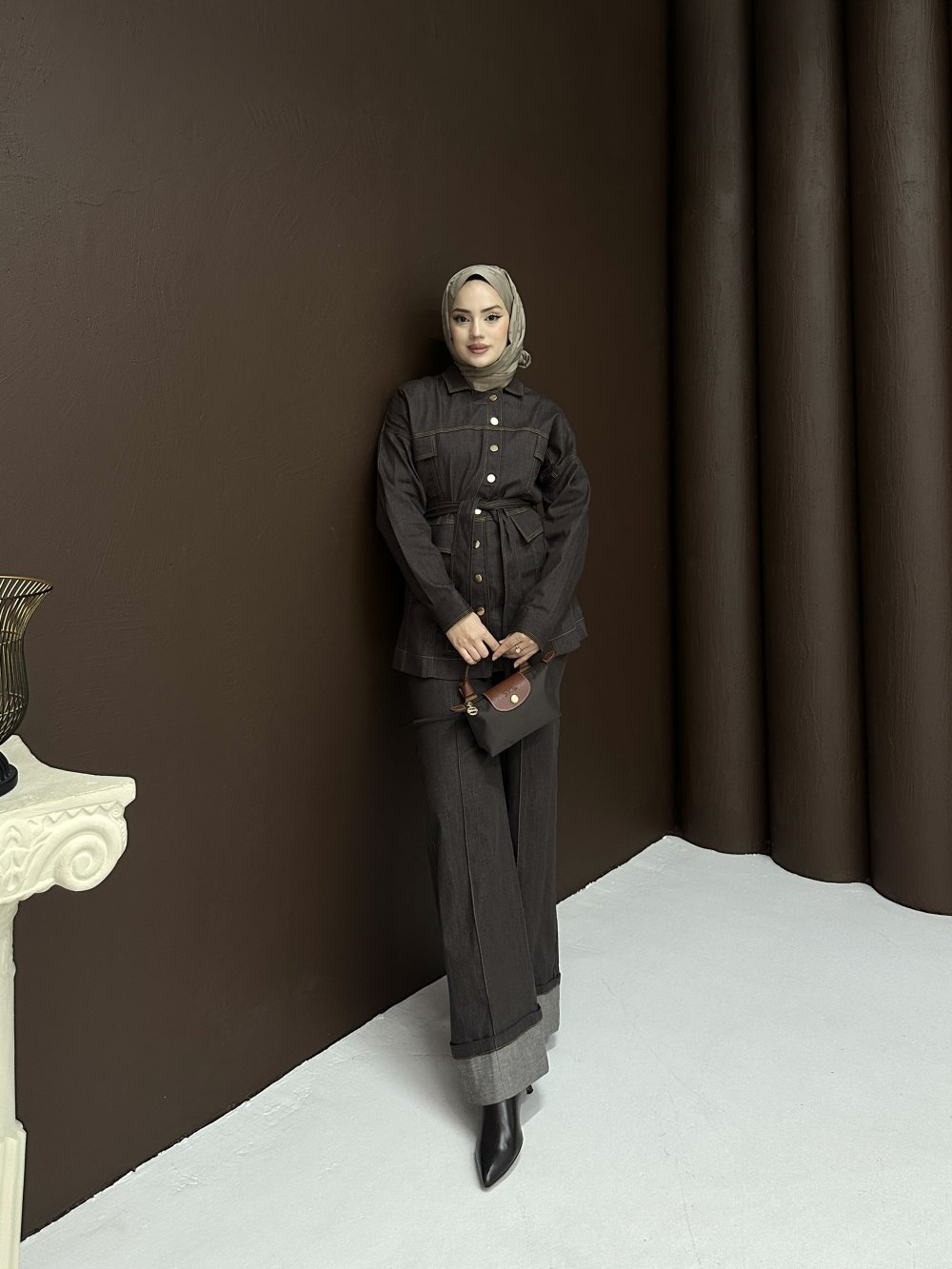 Alt: Yüksek bel, konforlu kesim, geniş paça (wide leg) tasarımı, modern bir dokunuş katan geniş duble (katlamalı) paça detayı.