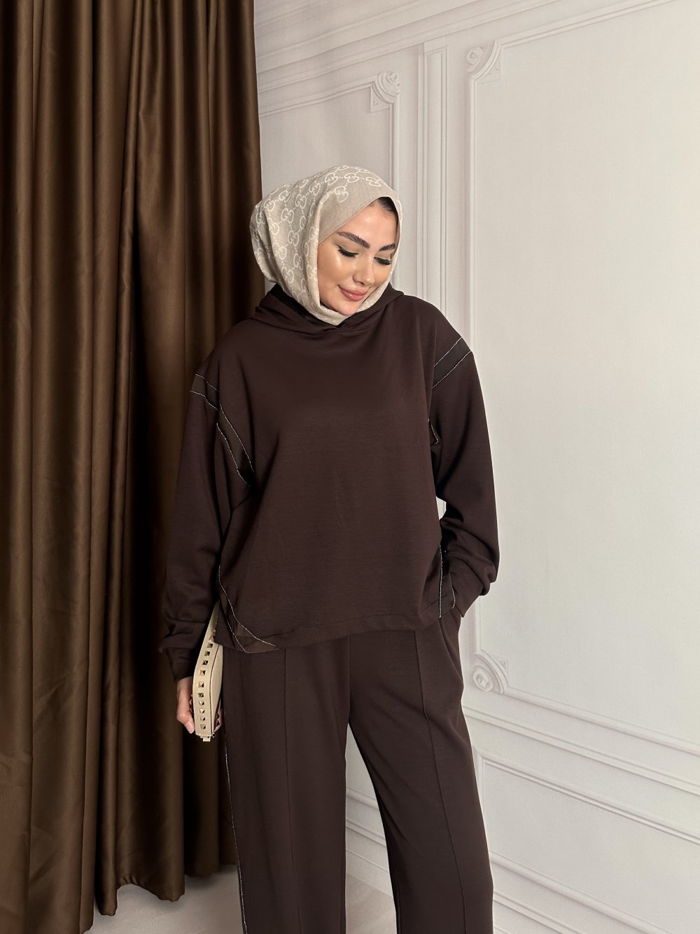 BYM MUADİL ŞERİT TAŞ DETAYLI TAKIM Kahverengi