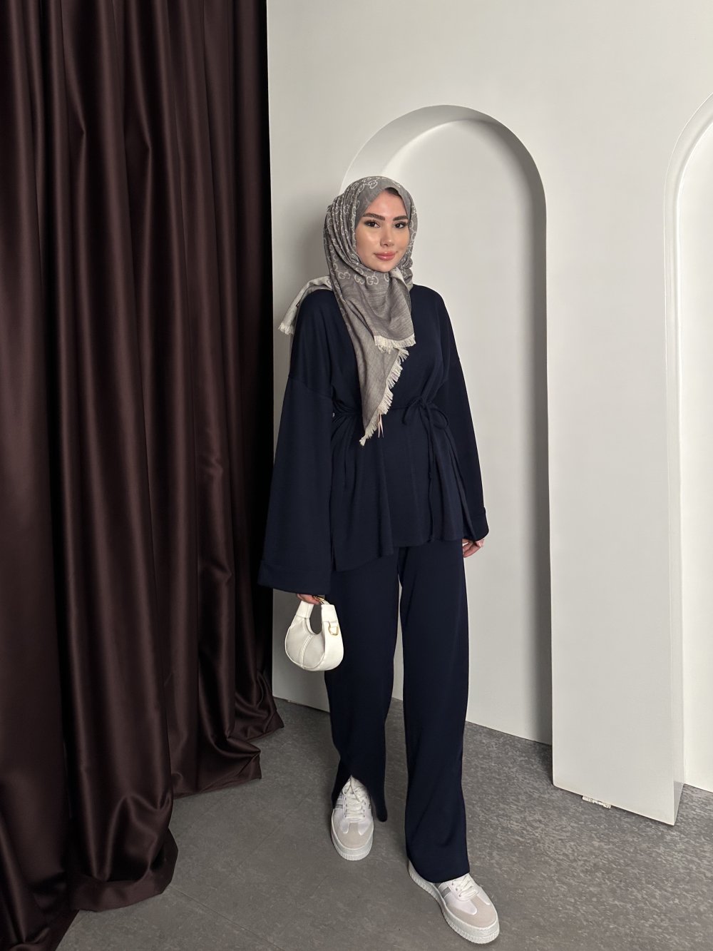Dökümlü kumaşı ve ispanyol paça pantolonuyla hareket özgürlüğü sunarken, belindeki ince ip detayıyla silüetinizi zarifçe vurguluyor. ✨