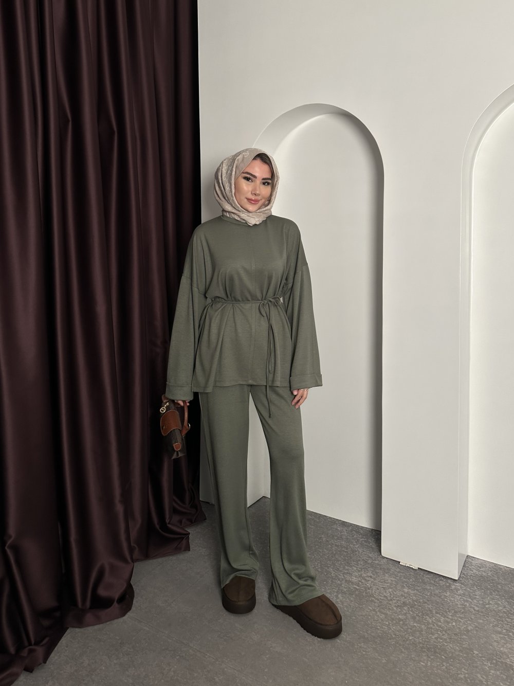 Dökümlü kumaşı ve ispanyol paça pantolonuyla hareket özgürlüğü sunarken, belindeki ince ip detayıyla silüetinizi zarifçe vurguluyor. ✨
