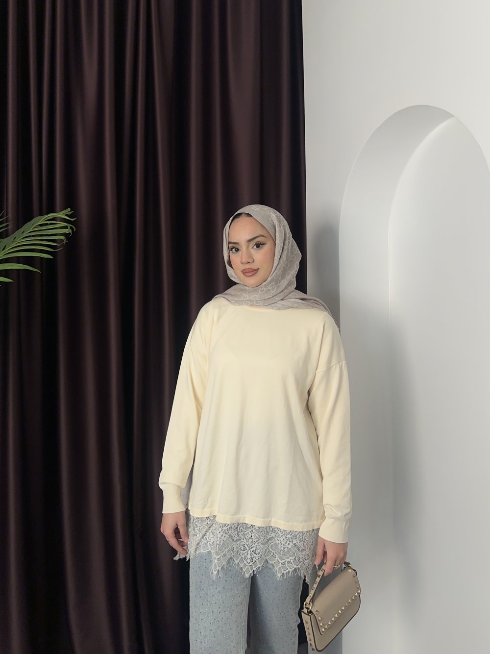 Dantel Detay Triko Krem
