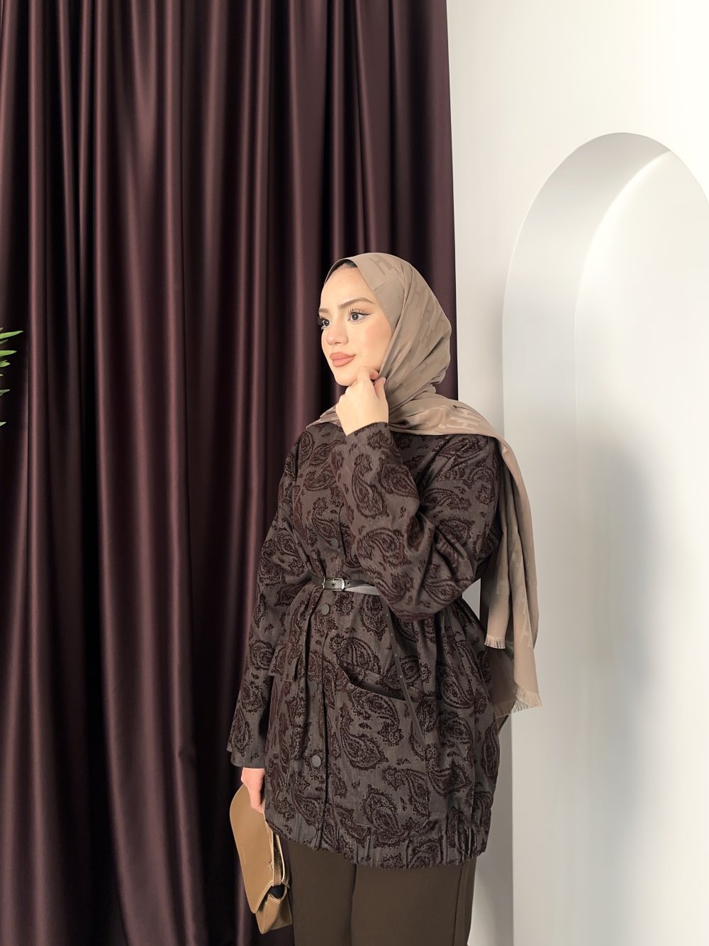 NAKIŞ DETAYLI KEMERLİ CEKET Acı Kahve