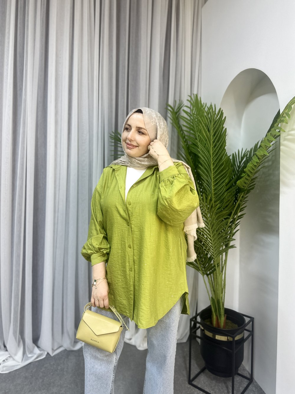 Işıltılı Gömlek Oversıze Yağ Yeşili