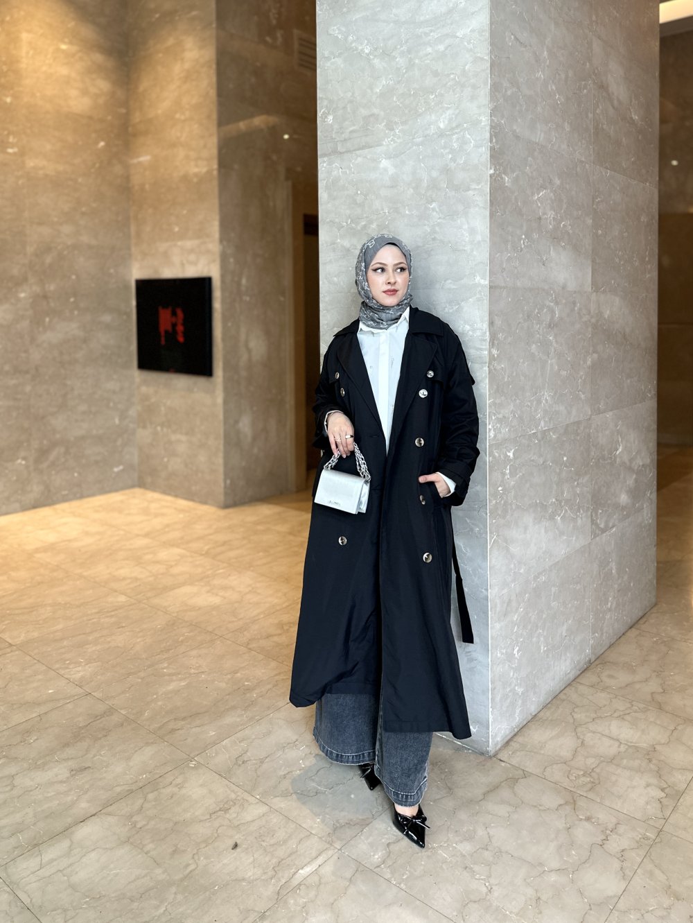 Kesim: Uzun ve düz kesimli. Diz altına kadar uzanıyor, bu da hem şıklık hem de iyi bir örtücülük sağlıyor.Omuzlarda apolet  düğmeli detaylar mevcut. 110 cm uzunluğunda