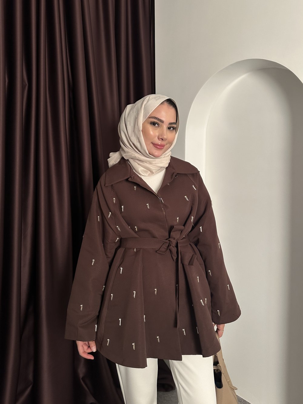 NAKIŞ DETAYLI KEMERLİ CEKET Acı Kahve