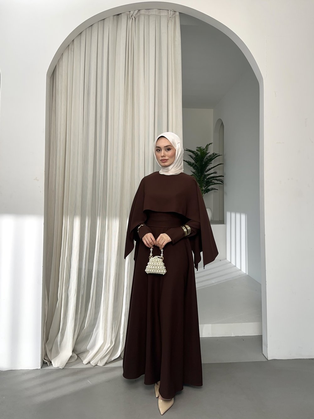 Pelerin Yaka Elbise Kahverengi