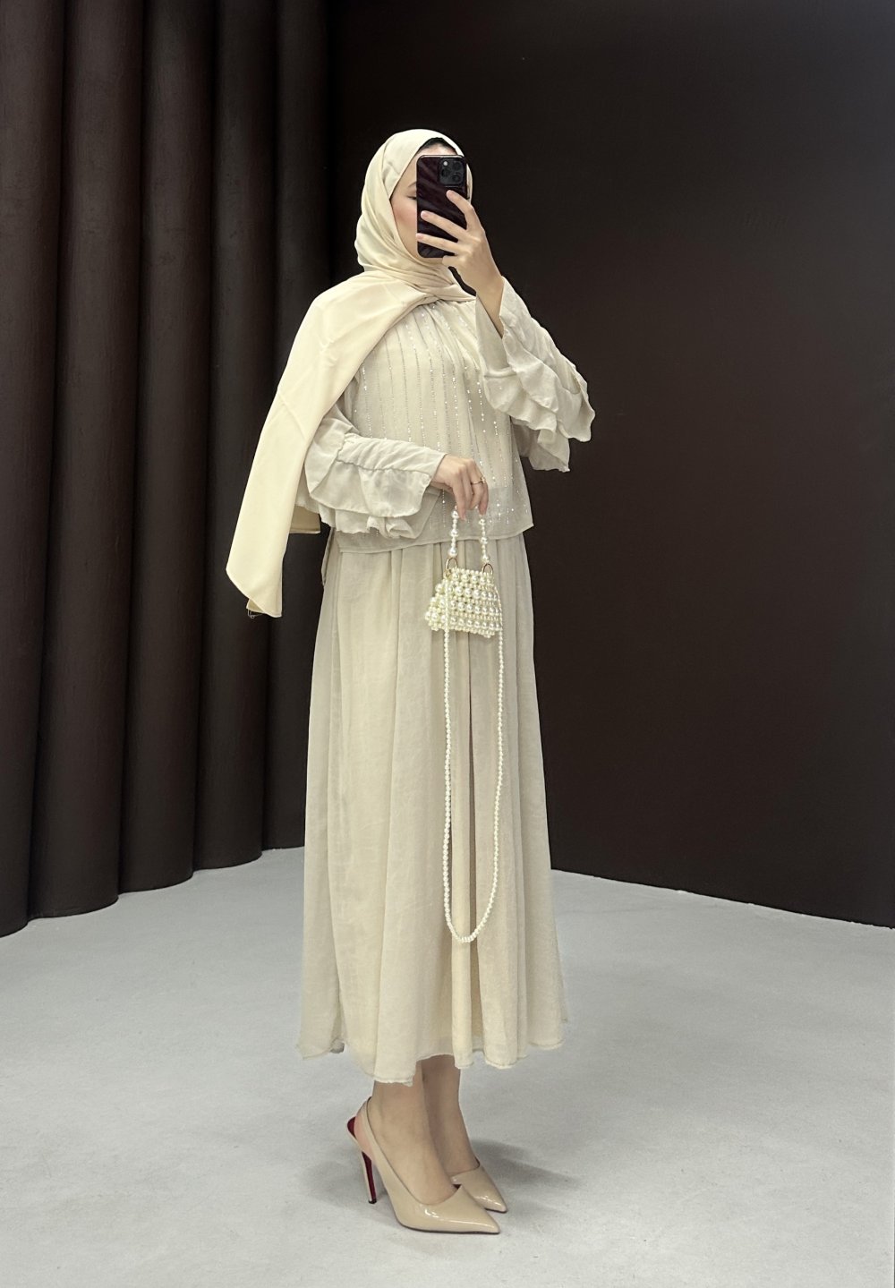 Üst: Boydan boya uzanan, silüeti daha ince ve uzun gösteren dikey ve kristal işlemeleri mevcuttur.